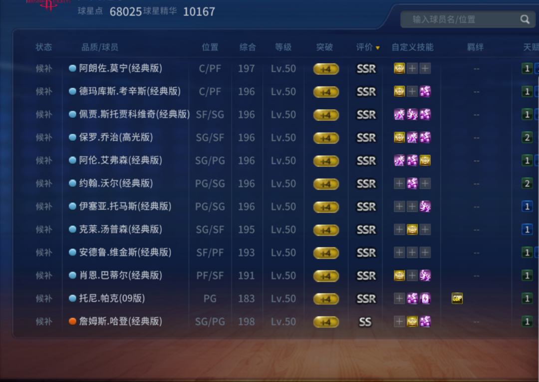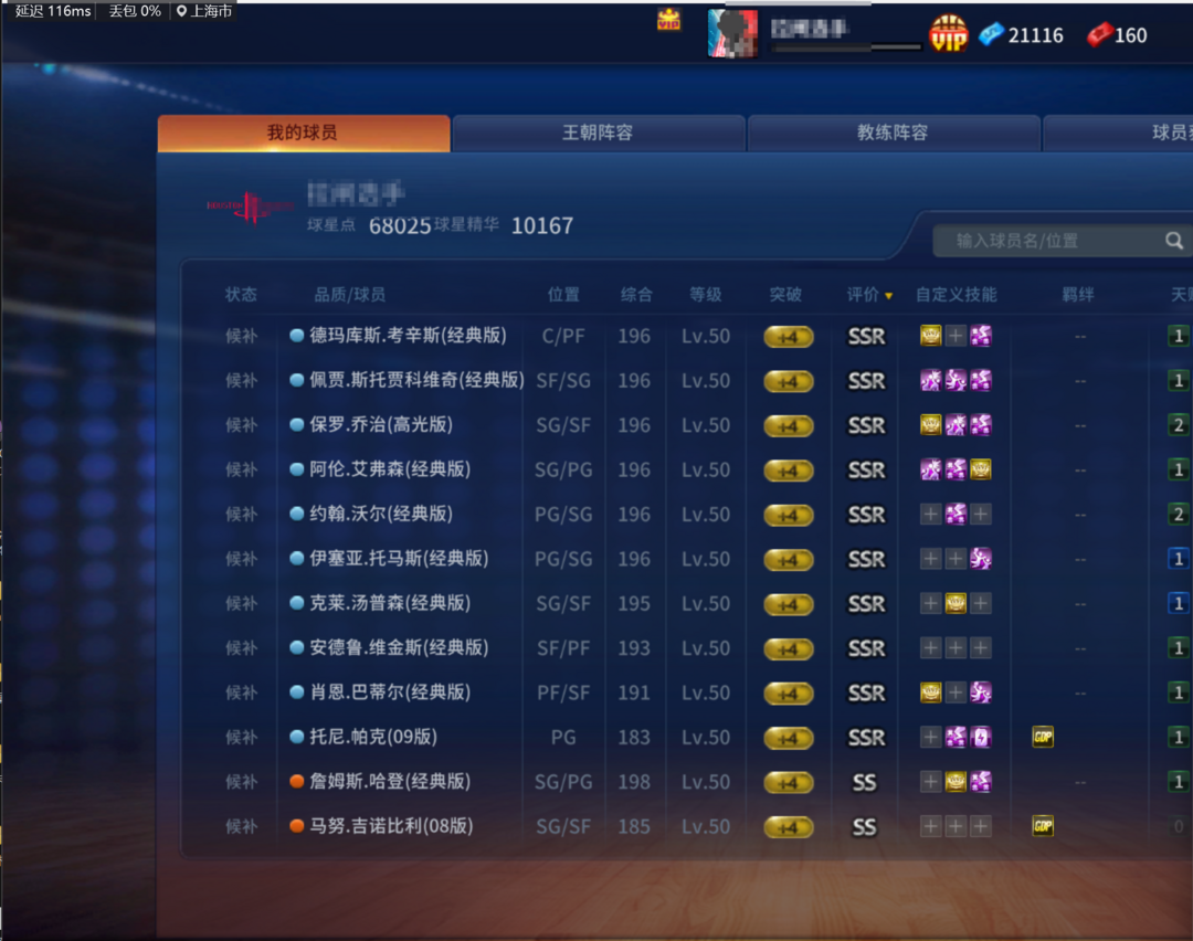 限制: 租号30次及以上 |装备描述:UR经典詹姆斯,UR经典姚明,UR经典麦迪,UR经典萨博尼斯,UR经典杜兰特,UR经典乔丹其余很多SSR,技能全满,干爽体验(免押金租用)