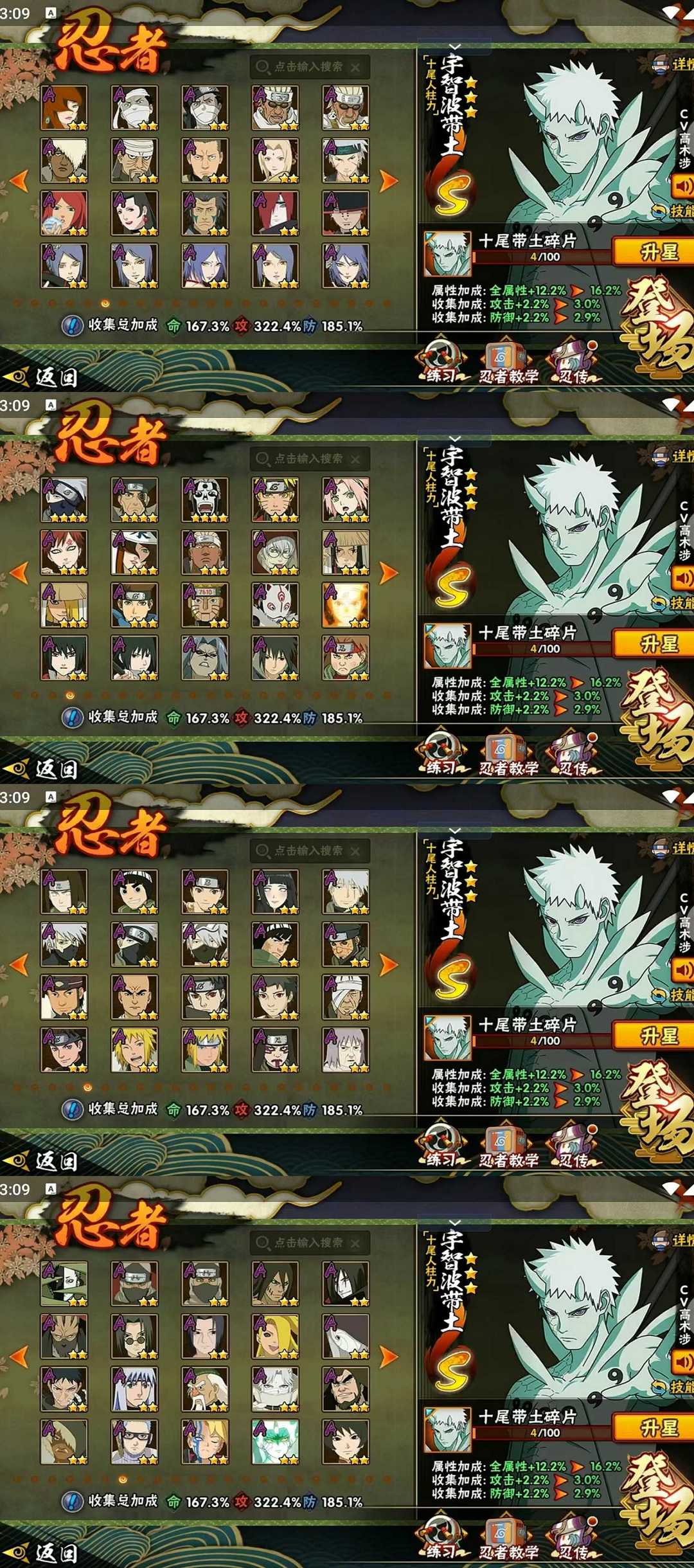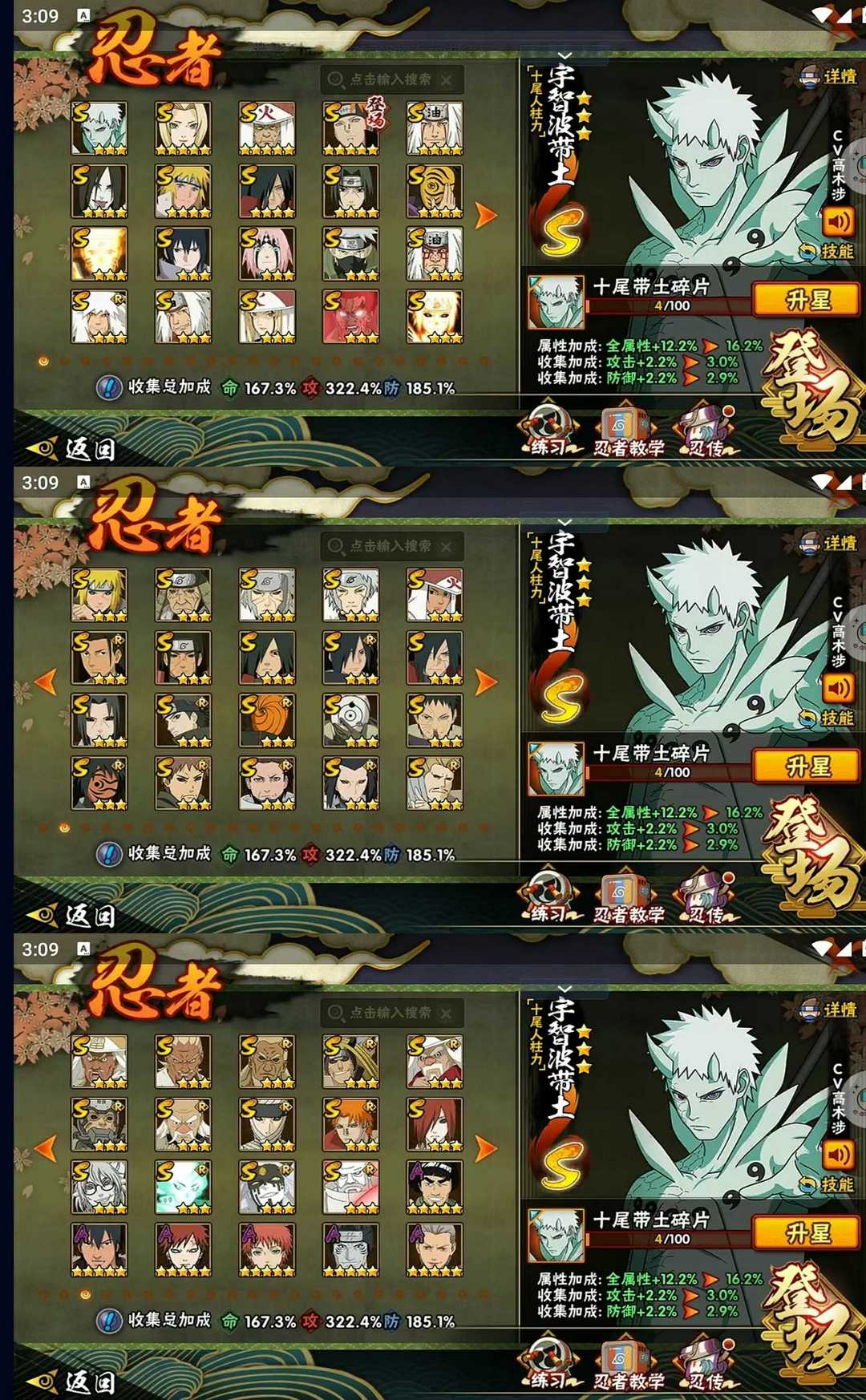装备描述:九喇嘛鸣人✨54S✨天道超✨白面具✨2310万战力✨忍战带土✨青年艾✨青年水门✨大野木✨鲛肌融合鬼鲛✨ 提示●游戏新机制:上号时上个租客还在线会直接显示在别处登陆,重新登录顶掉就行,我是不会恶意顶号的