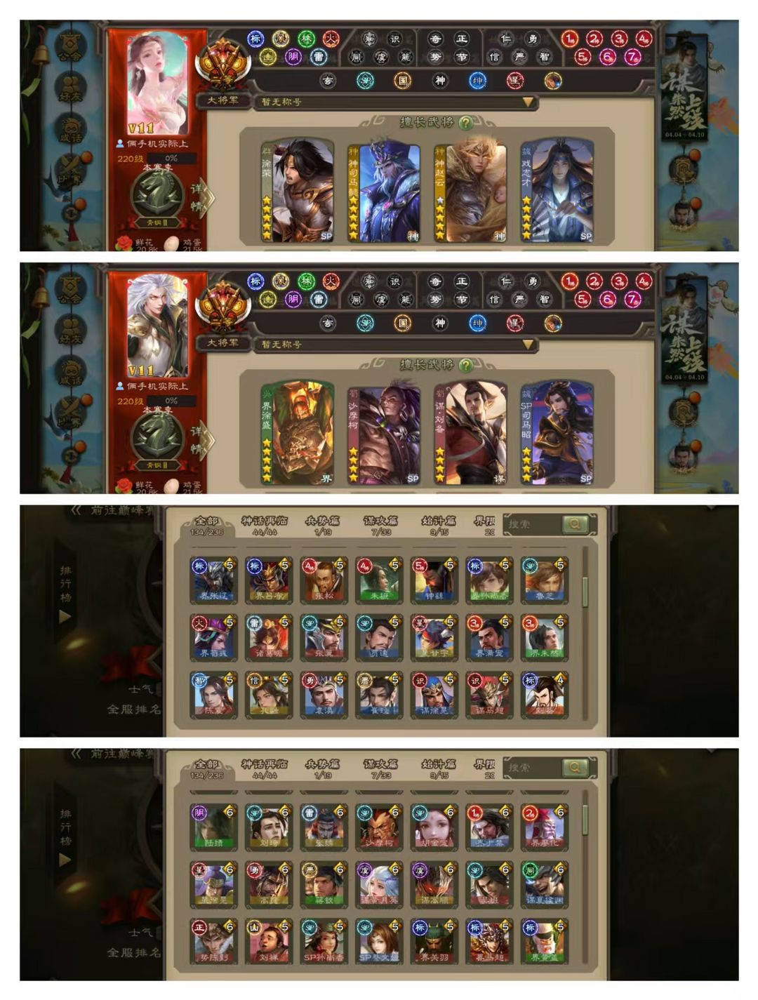 限制: 撤单率<19%才可租用此帐号装备描述:官方二等大将军,无卡,VIP11! 5五星炎龙:徐荣戏志才动皮! 15四星玉龙:界徐盛程昱动皮,沙摩柯金皮,势于吉留赞许攸界左慈,神司马懿陆逊赵云! 50史诗武将,司马昭动皮,张让金皮,谋黄月英司马徽星甘宁祢衡界钟会等! 135排位武将,35动皮86金皮165国战皮肤!