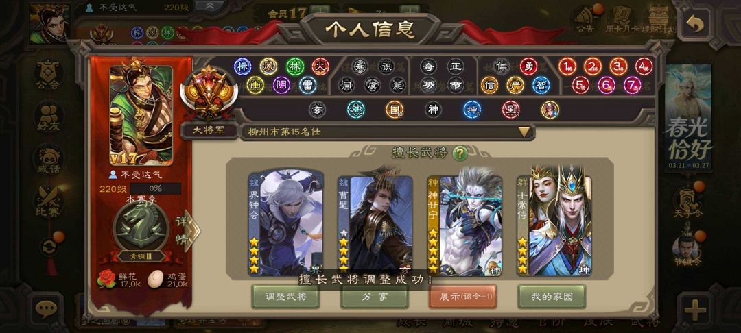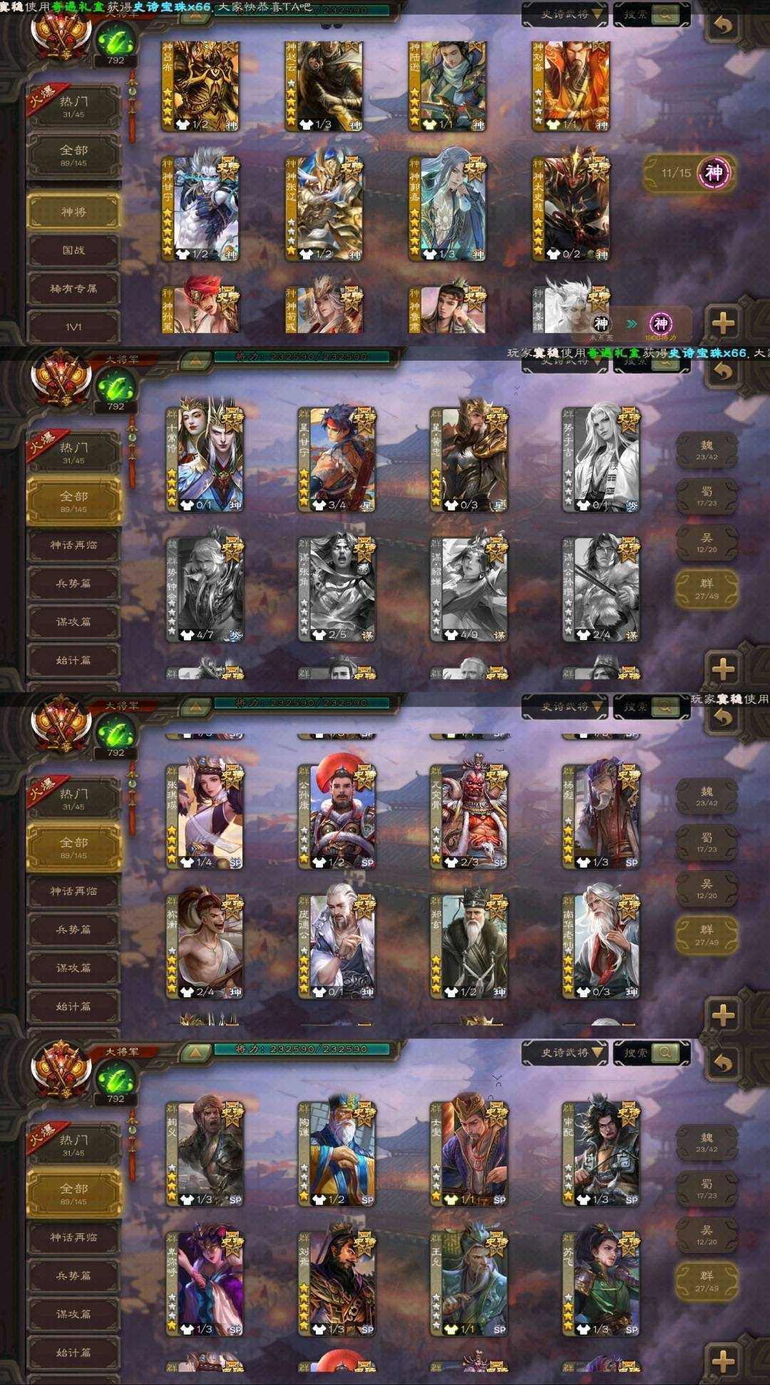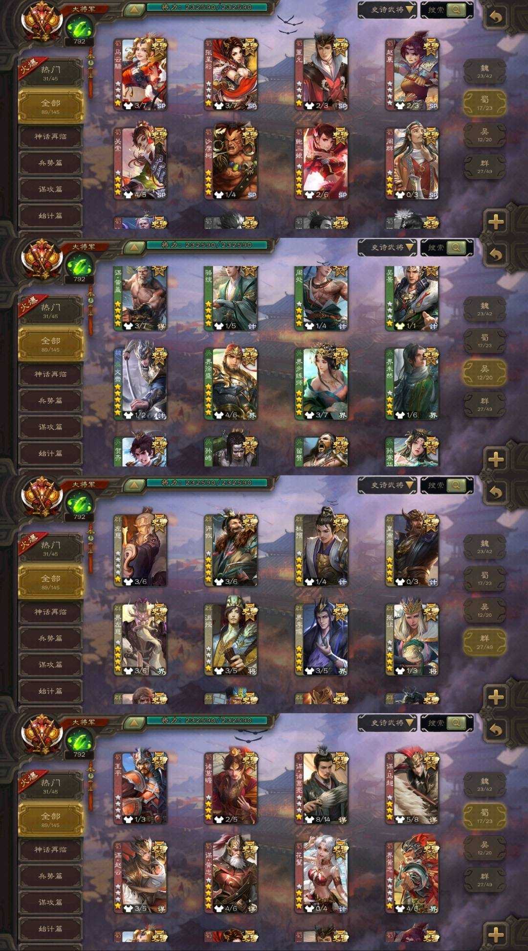 装备描述:史诗武将数量:89 神将: 神甘宁,神郭嘉,神刘备,神陆逊,神吕布,神孙策,神太史慈,神荀彧,神张辽,神赵云,神鲁肃 魏国武将: 刘晔,戏志才,曹纯,曹婴,陈琳,程昱,郝昭,嵇康,界曹真,界于禁,界钟会,马钧,司马师,王凌,王元姬,文鸯,羊徽瑜,杨修,王粲,张昌蒲,星周不疑,曹髦,SP司马昭 蜀国武将: 鲍三娘,董允,关索,花鬘,界黄忠,谯周,沙摩柯,王平,张星彩,赵襄,周群,诸葛瞻,谋马超,谋赵云,谋黄忠,马云騄,谋诸葛亮 吴国武将: 贺齐,界步练师,界徐盛,界朱然,留赞,骆统,孙寒华,孙皓,吴景,周处,文鸯,谋黄盖 群国武将: 卑弥呼,杜预,公孙康,界李儒,界左慈,沮授,刘焉,祢衡,南华老仙,庞德公,麹义,审配,士燮,苏飞,陶谦,王允,兀突骨,星甘宁,星黄忠,许攸,杨彪,张琪瑛,张让,郑玄,左慈,皇甫嵩,十常侍